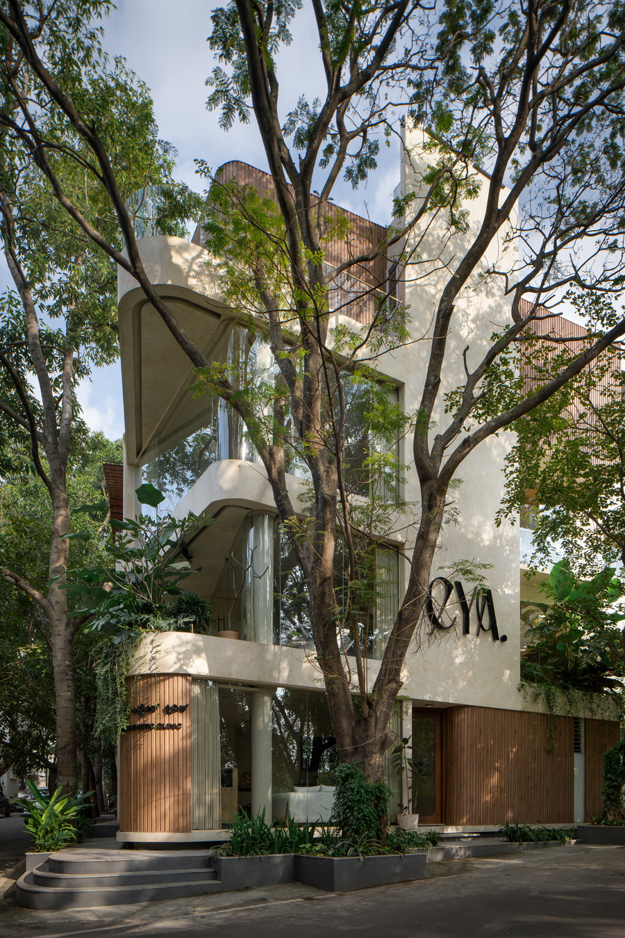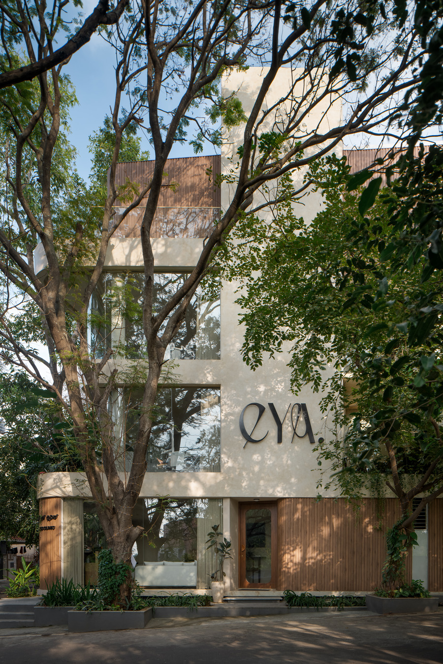 The corner where the road meets was an acute angle, from where you had a long visibility and the huge tree canopies gave the initial impetus to the design development. The Edges where softened so that we reduce on the rigid vertical lines on the façade, so that the building appears to be bigger. The glazed façade on the road side ensured enough light and ventilation. At the upper levels extensive use of glass helped in establishing the connection with tree canopies giving a feel of tree house.