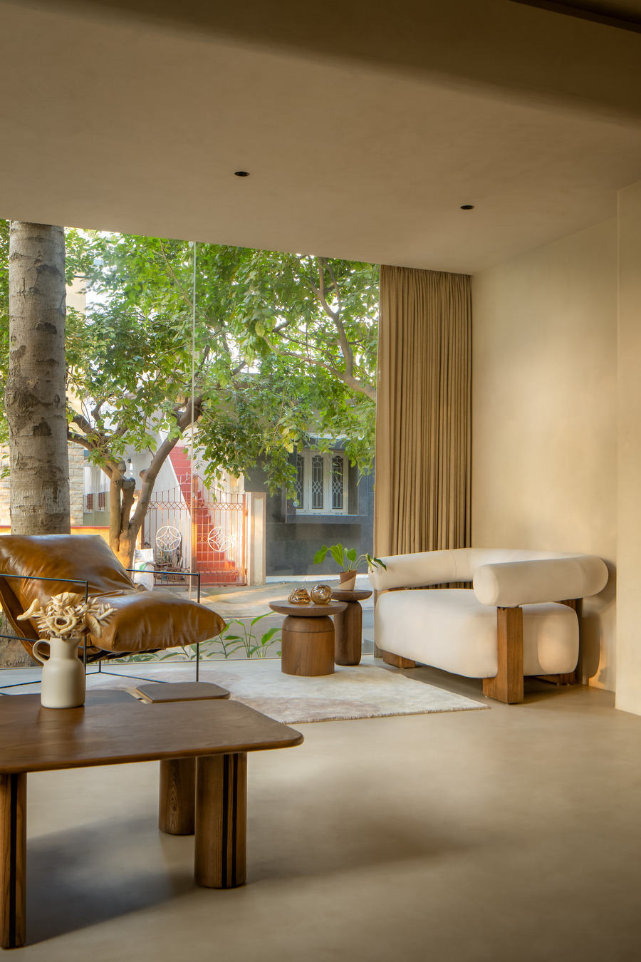 In terms of the materials, a monochromatic palette across the building was used, so that it looks cohesive without any fragmentation. The interior also has got a micro concrete floor matching the wall and ceiling with the accents of wood. A filleted corner, with arched openings and curved false ceiling makes the defining lines invisible makes the interior seamless.