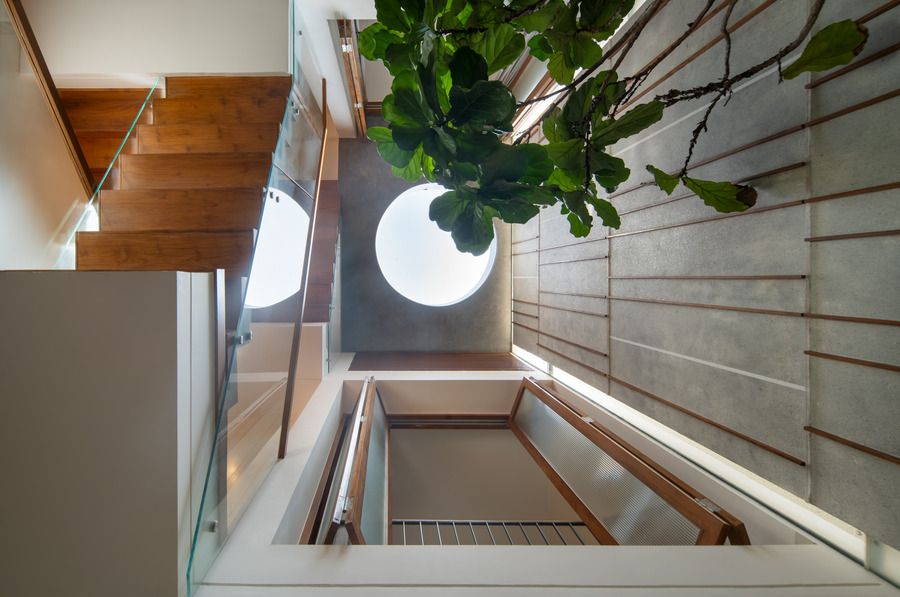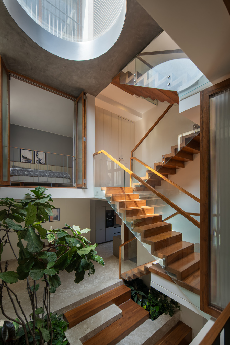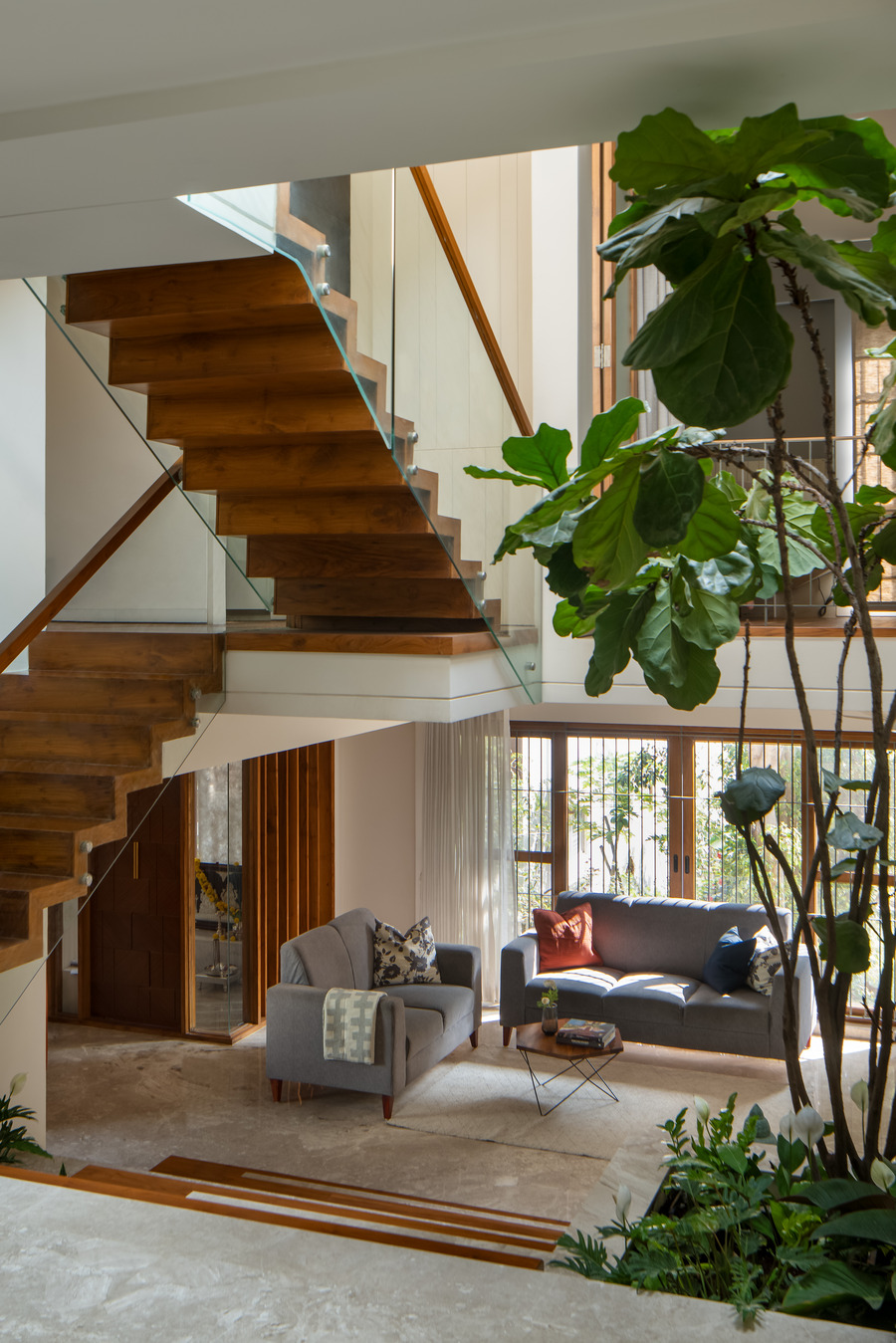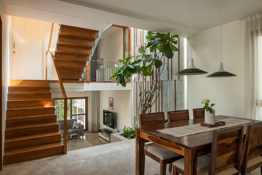 As a response to brief, the half split floor plates, straddled across the open to sky court, gave a flexibility to give a large opening internally without compromising of privacy. The first series of flight connecting living to dining & Kitchen is articulated as informal seating acting as an extension of living room.