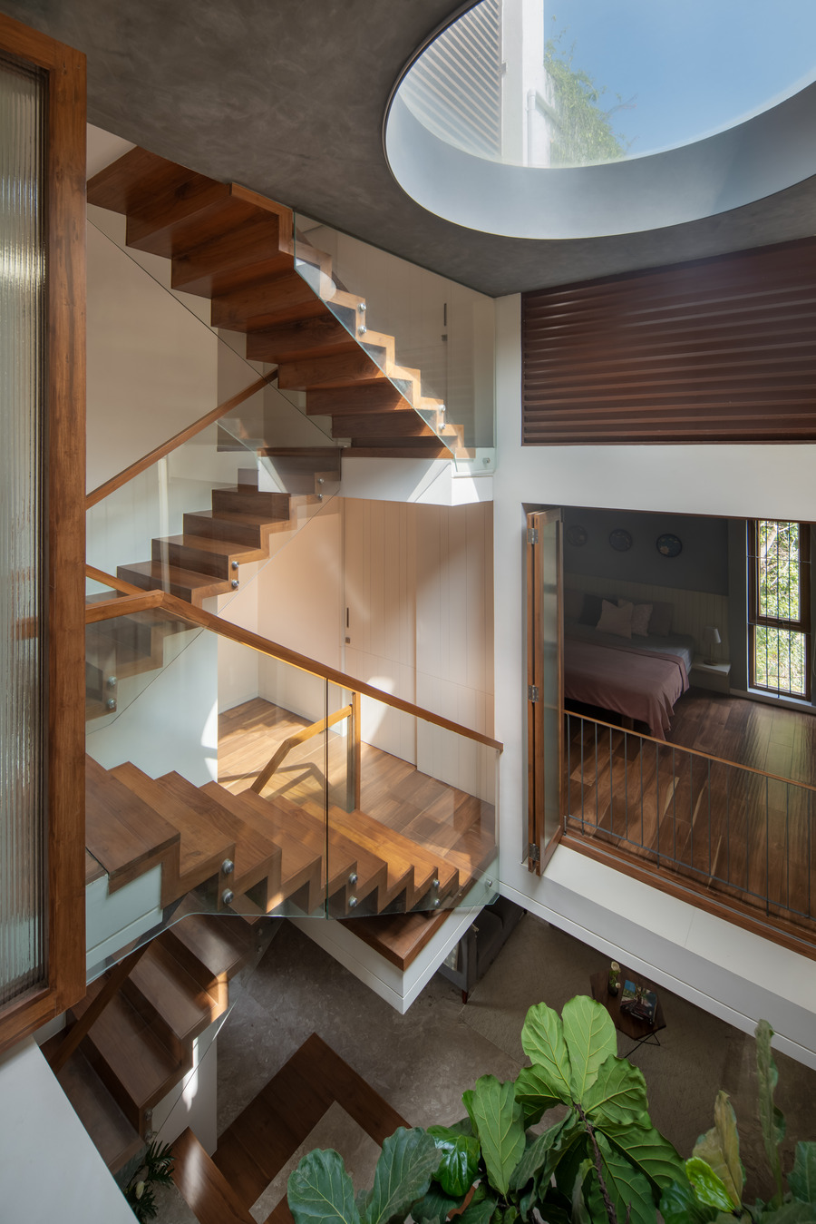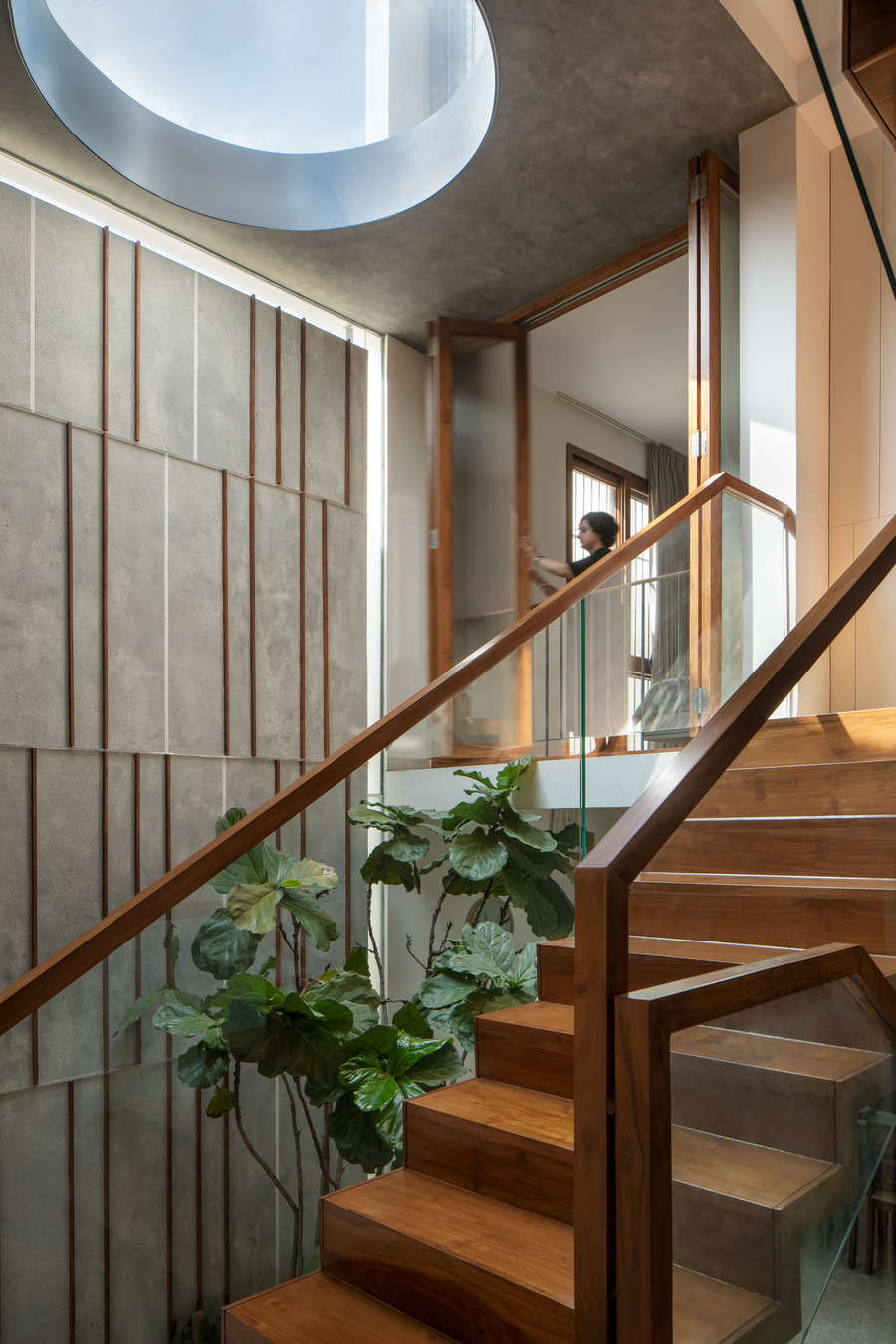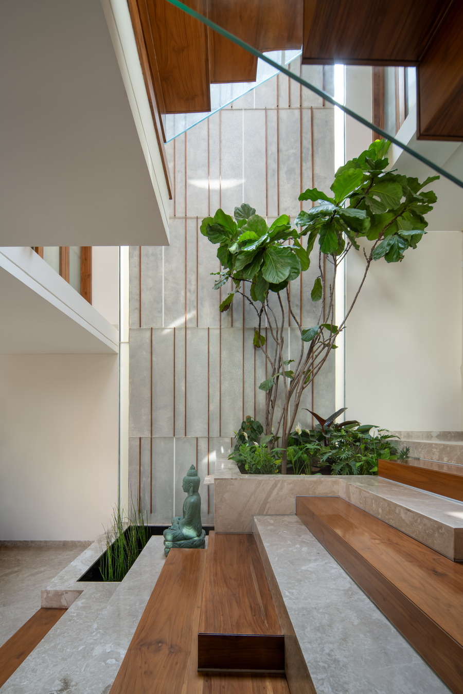 As a response to brief, the half split floor plates, straddled across the open to sky court, gave a flexibility to give a large opening internally without compromising of privacy. The first series of flight connecting living to dining & Kitchen is articulated as informal seating acting as an extension of living room.